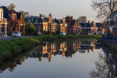 Beautiful old houses on the city embankment of Leiden at sunset.