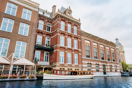 Amsterdam, Netherlands September 5, 2017 : Outdoor view of Canal cruise museum tour building bar and restaurant