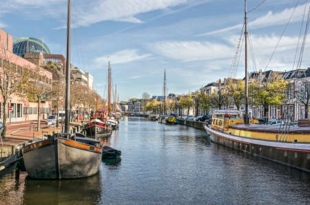 Leeuwarden, The Netherlands, November 3, 2018: historic barges in Zuiderstadsgracht canal, with old houses on the right and more modern buildings on the left