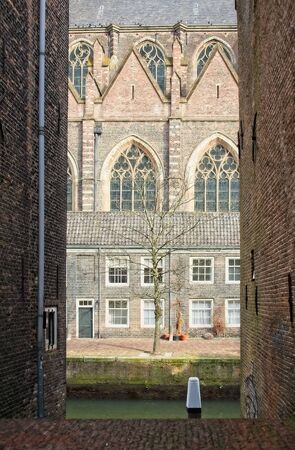 Part of Minster or Church of Our Lady in Dordrecht through narrow opening hole between houses across water canal.