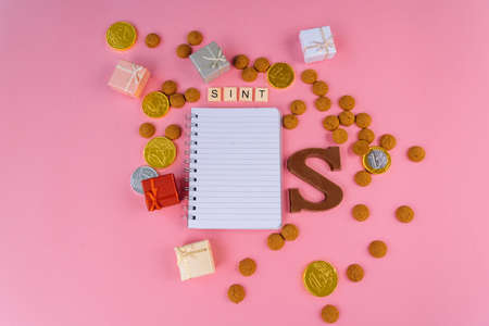 Letter for Sinterklaas . St Nicholas Day background. Greeting Card with traditional food - pepernoten, chocolate letter, gift, carrots for horse. Concept for party in Saint Nicolas day five december.