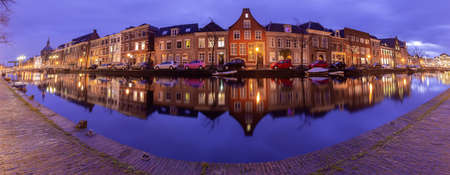 Panorama of the city embankment in Leiden at sunrise.