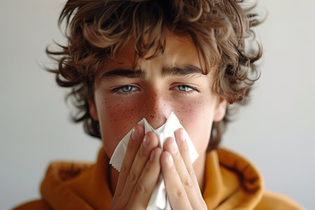 Sick teenage boy blowing his nose with a tissue, close up