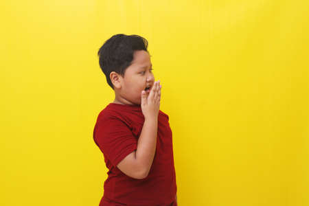 Wow and amazed expression of asian boy. Advertisement concept. Isolated on yellow background