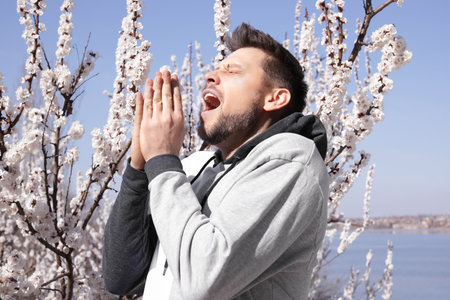 A man sneezes on a spring street, allergies