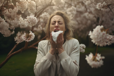 A female sneeze with a napkin in a booming cherry blossom woods in Spring due to pollen allergy. Spring seasonal concept. AI generated.