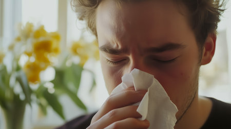 A young man suffers symptoms of a cold, flu or allergy, and blows his nose in a tissue