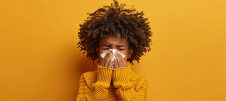 A young woman caught mid-sneeze with tissues flying around her, set against a vibrant orange background. Her hair is slightly messy, creating a dynamic and eye-catching scene.