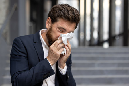 A man in formal business attire uses a tissue to sneeze while standing outdoors during daytime. The image conveys themes of health, cold, and seasonal allergies in a professional environment.