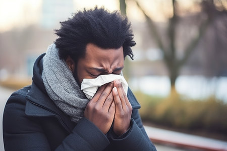 sick african american man sneezing in tissue outdoors