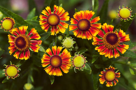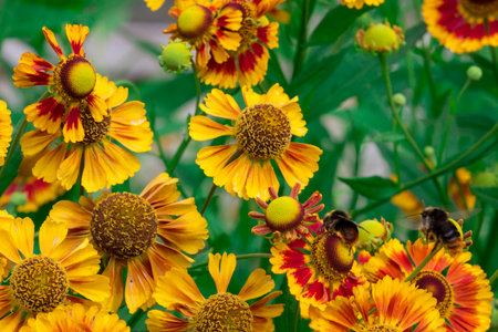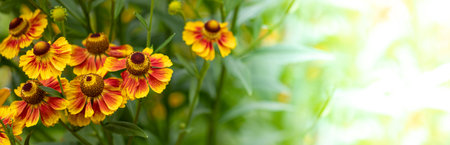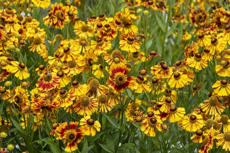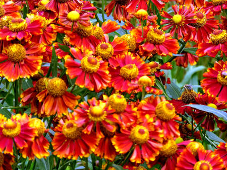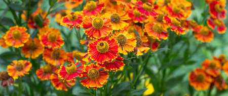 Helenium Konigstiger. Helenium. Helenium autumnale. Bush Helenium. Green leaves. Beautiful bright flowers. Perennials. Long-flowering plant. Summer days. Horizontal photo