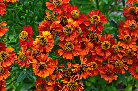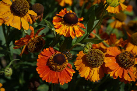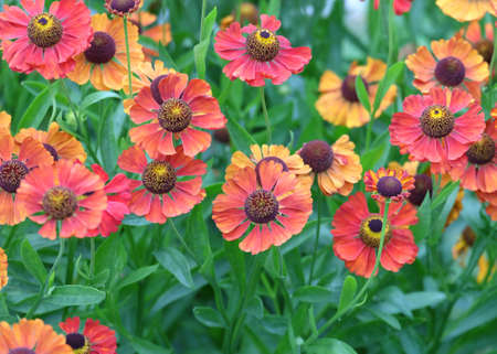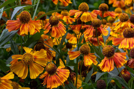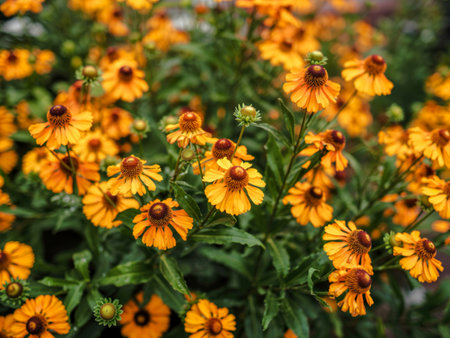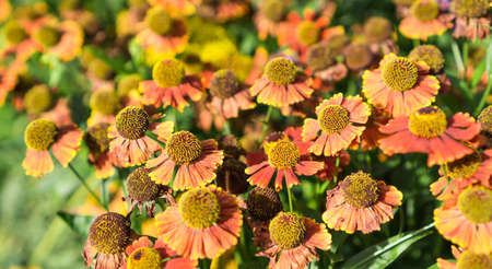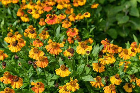 Beautiful Helenium flowers growing in the summer garden. Close up of orange Helenium autumnale flowers with blurred background.