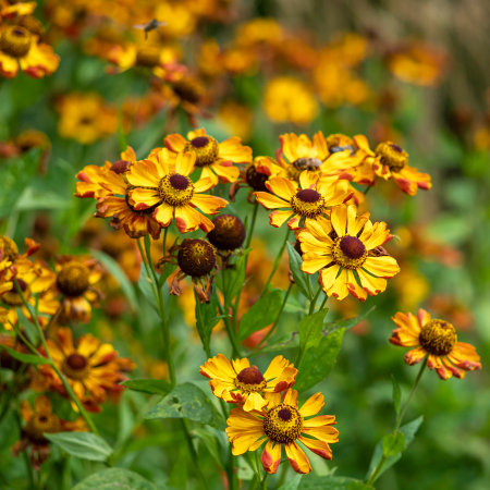 Pretty golden Helenium Moerheim Beauty sneezeweed flowers in a garden