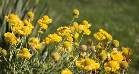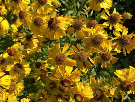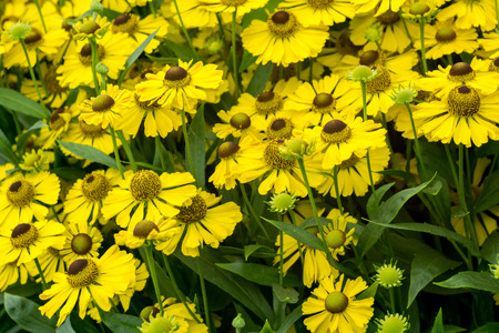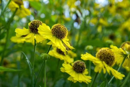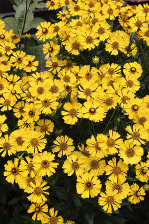 Yellow flowers of Helenium autumnale on flowerbed in the ornamental garden