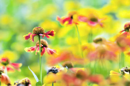 yellow and red helenium flowers. colorful detailed macro photo of a flower. blurred background with highlights, bokeh. space for text. natural beauty. Helenium hybridum.