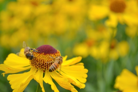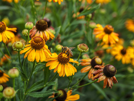 Honey bee gathering pollen on a yellow Helenium sneezeweed flower in a garden