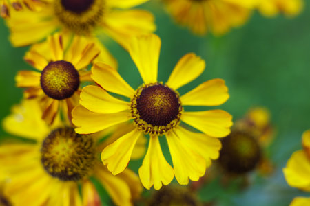 Beautiful yellow helenium flowers on a green background. Beautiful perennial garden flower.