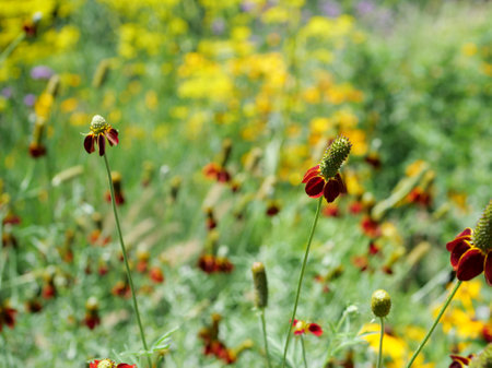 Yellow coneflowers blooming in a summer meadow during a golden hour sunset