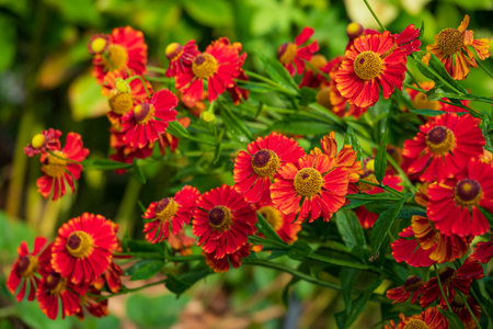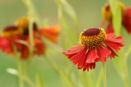 Colorful closeup on the ye-catching red flower variety of Helenium Moerheim beauty, gainst a green background