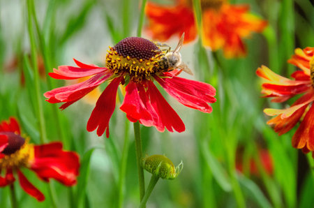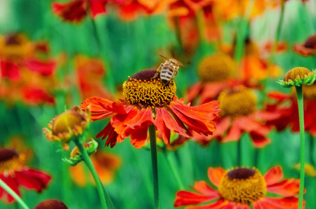 A bee sitting Helenium Moerheim Beauty sneezeweed in flower during the summer months. Wetern Honey Bee Apis mellifera on helenium flower. High quality photo