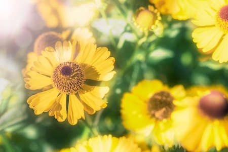 Yellow perennial autumn flowers helenium in the sun. Autumn card with flowers. Selective focus. Bokeh. Copy space