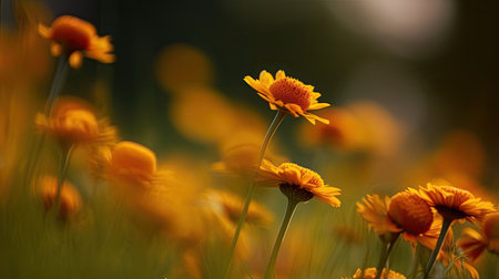 A vibrant close up of fiery yellow кed garden flowers bathed in morning sunlight,