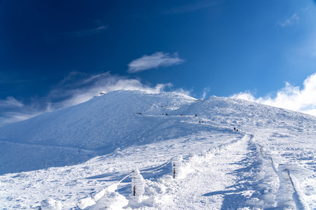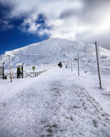 KARPACZ, POLAND - JANUARY 06, 2021: Tourist trail to Sniezka (mountain on the border between the Czech Republic and Poland). Winter landscape. Giant Mountains, Poland, Europe.
