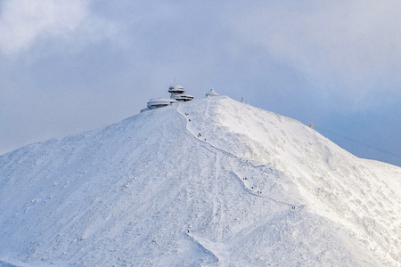 KARPACZ, POLAND - MARCH 08, 2020: Snezka or Sniezka (in Czech and Polish) is a mountain on the border between the Czech Republic and Poland. Winter landscape. Giant Mountains, Poland, Europe.