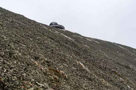Meteorological observatory building on the peak of Sniezka in the Giant Mountains in cloudy weather. Border of Poland and the Czech Republic.