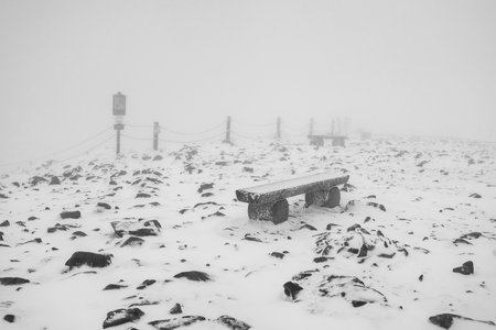 Winter landscape. The peak of Sniezka, Karkonosze Mountains on the border of Poland and the Czech Republic. Black and white.