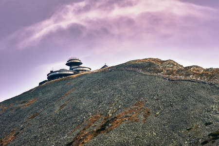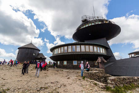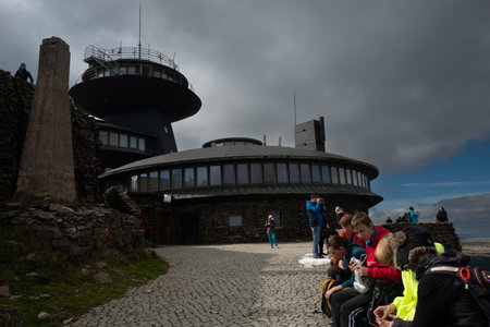 Karpacz, Sniezka Mountain, Poland September 23, 2022: High Mountain Meteorological Observatory. Tourists on top of Snezhka Mountain. Poland
