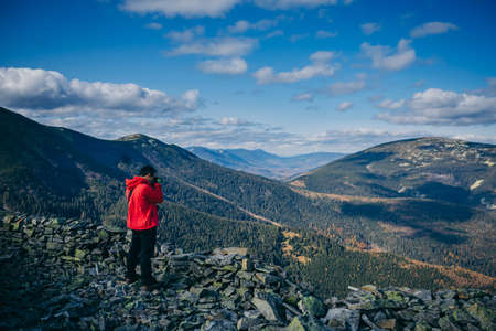 Woman hiker in yellow jacket with backpack hiking green forest and mountains at sunny autumn day.