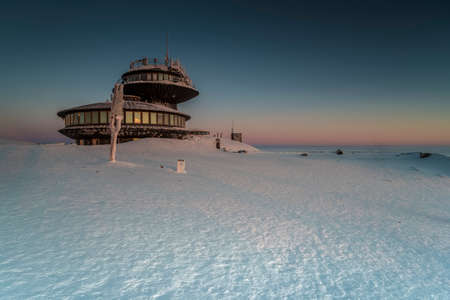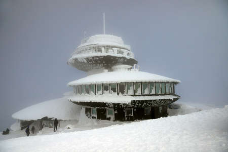 Meteorological Observatory on Snezka in winter scenery, building is named UFO. Karkonosze Mountains, Poland
