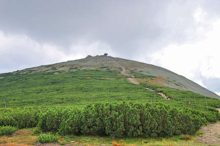 View of Sniezka in summer. The highest peak of the Karkonosze Mountains. Tourists join the mountain trail. Karkonosze National Park