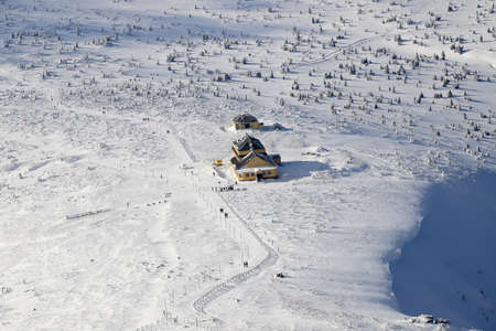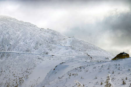 Snow-covered mountain slope and shelter in the Giant Mountains, Poland