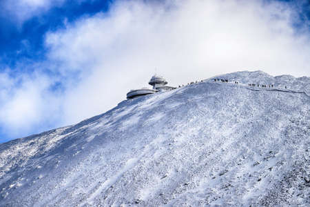 KARPACZ, POLAND - MARCH 08, 2020: Snezka or Sniezka (in Czech and Polish) is a mountain on the border between the Czech Republic and Poland, Karkonosze National Park, Poland, Europe.