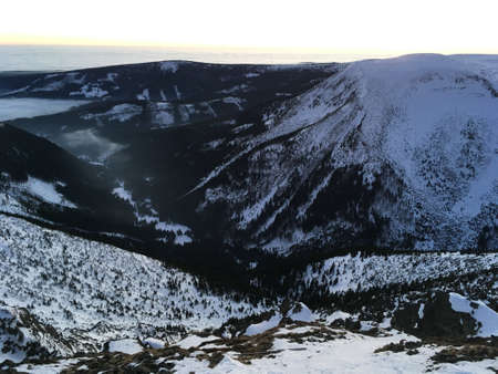 Late evening view of Snezka mountain landscape. Sunset over cold winter mountain landscape.