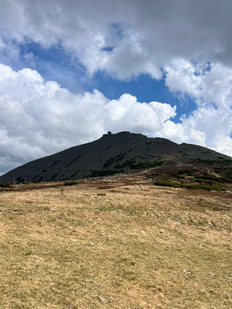 Panoramic view of Snezka mountain with meteorological observatory on the top, Krkonose National Park in Czechia, Karpacz in Poland