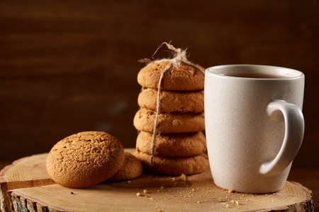 White cup of tea and bunch of cookies on a log over country style wooden background, close-up, selective focus