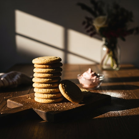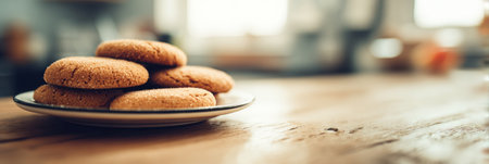 Delicately arranged cookies sit on a small plate atop a rustic wooden table, illuminated by soft natural light entering the room.