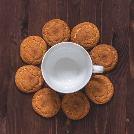 Cup of coffee and oatmeal cookies on wooden background. Top view