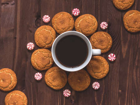 Cup of coffee, oatmeal cookies and candy on wooden background Top view