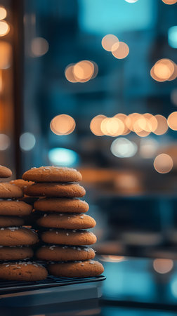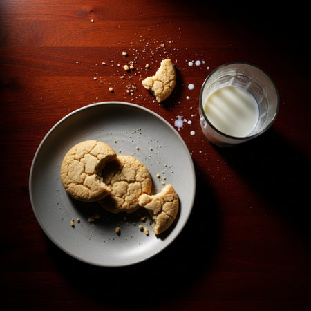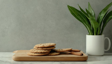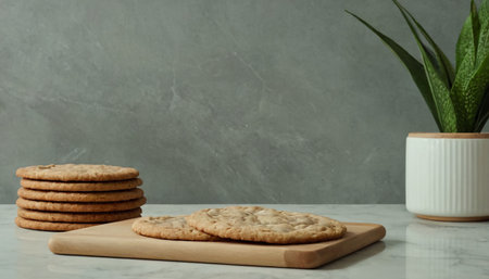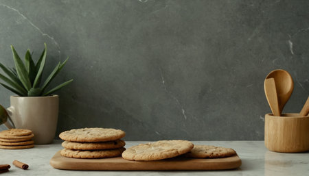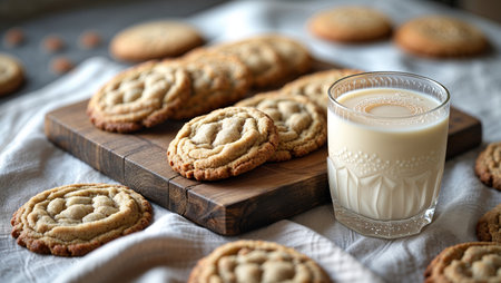 Delicious homemade cookies served on a wooden board with a glass of milk in a cozy kitchen setting