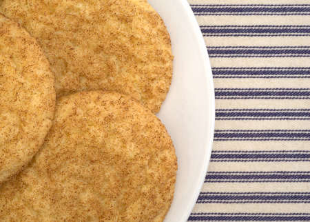 Top close view of freshly baked snickerdoodle cookies on an off white plate atop a blue striped tablecloth.