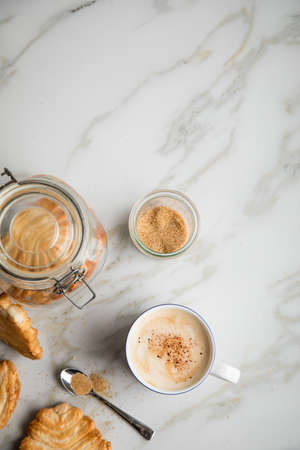 Italian puff pastry fan wavers cookies biscuits with preserving glass jar and cup of coffee on marble table background
