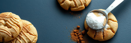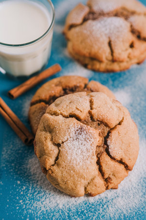 Freshly baked cookies arranged on a blue surface with sugar and cinnamon