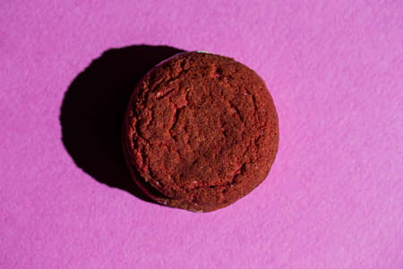 Closeup Image of One Separate Chocolate Macaron Placed Over Pink Background. Horizontal image