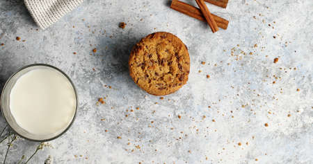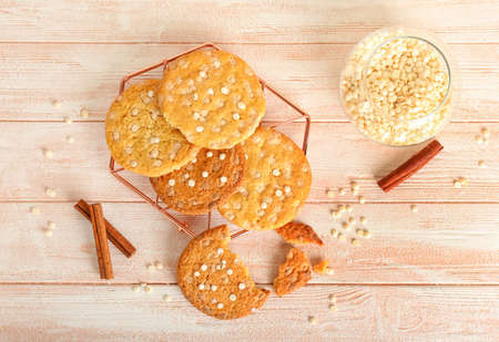 From above view of glass of milk with biscuit and cinnamon placed near on white background