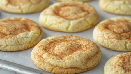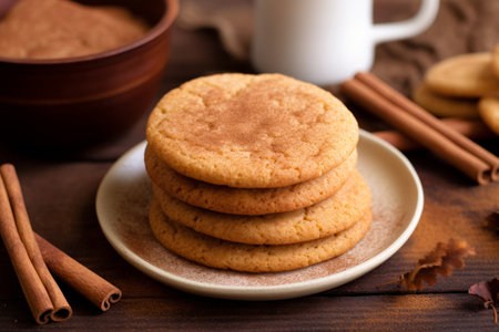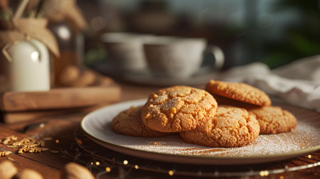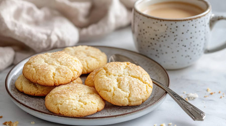 plate of snickerdoodle cookies with gentle steam from nearby coffee mug, warm soft shadows v 7, Generative AI