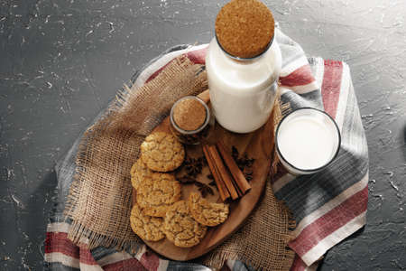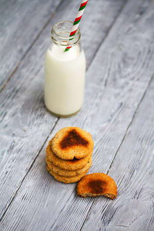 Bottles of milk with red striped straws and chip cookies on grey wooden background